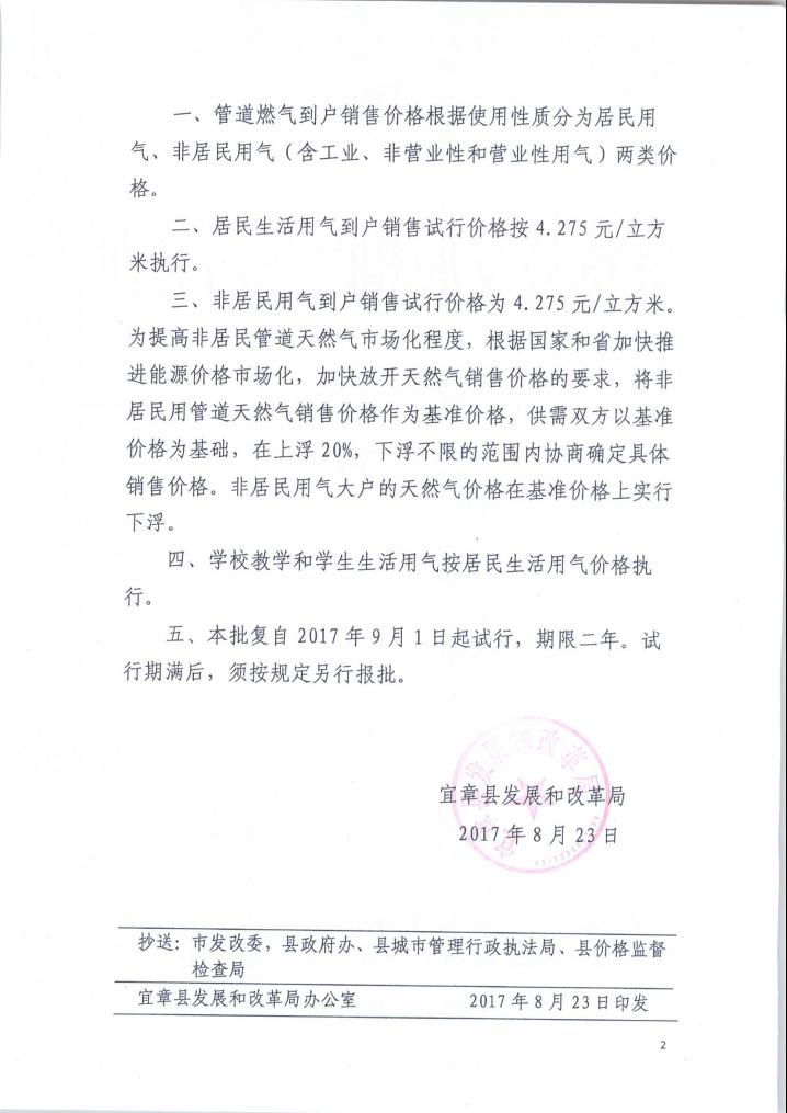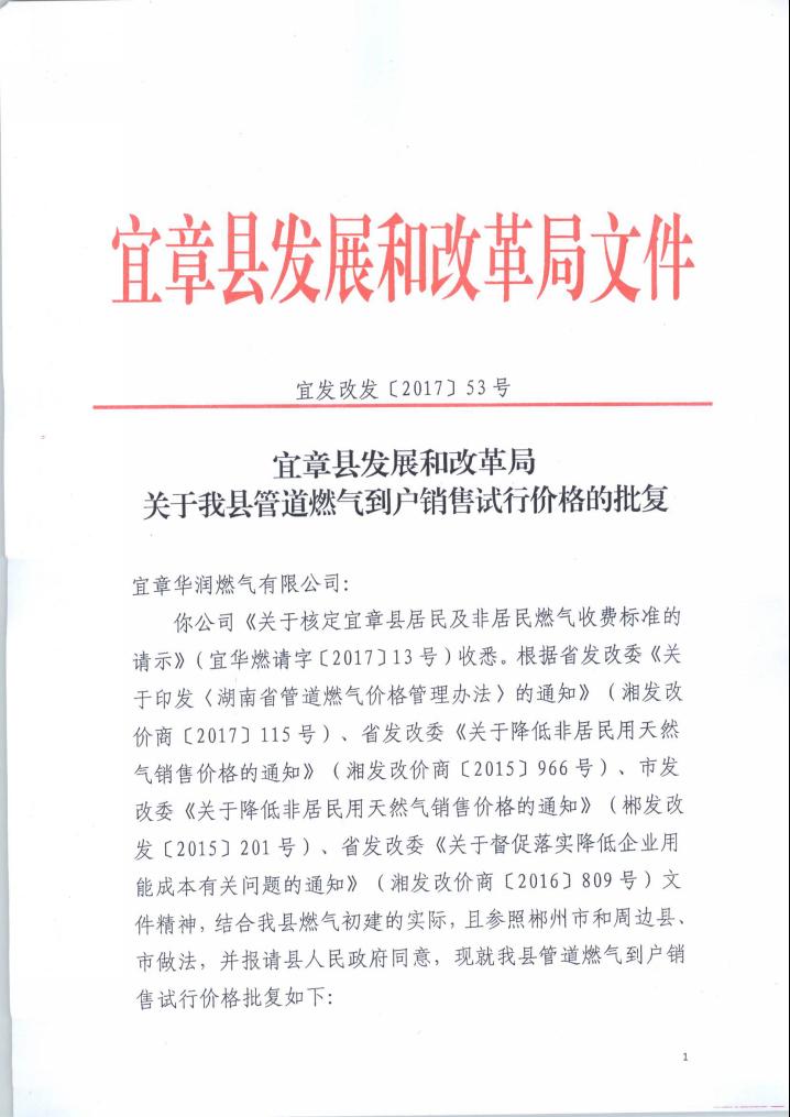 关于我县管道燃气到户销售试行价格的批复