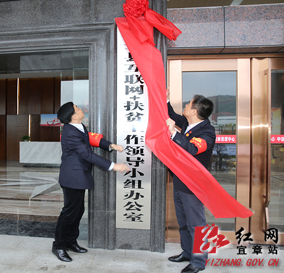 图为王建球、张润槐为“宜章县互联网+社会扶贫工作领导小组办公室”揭牌
