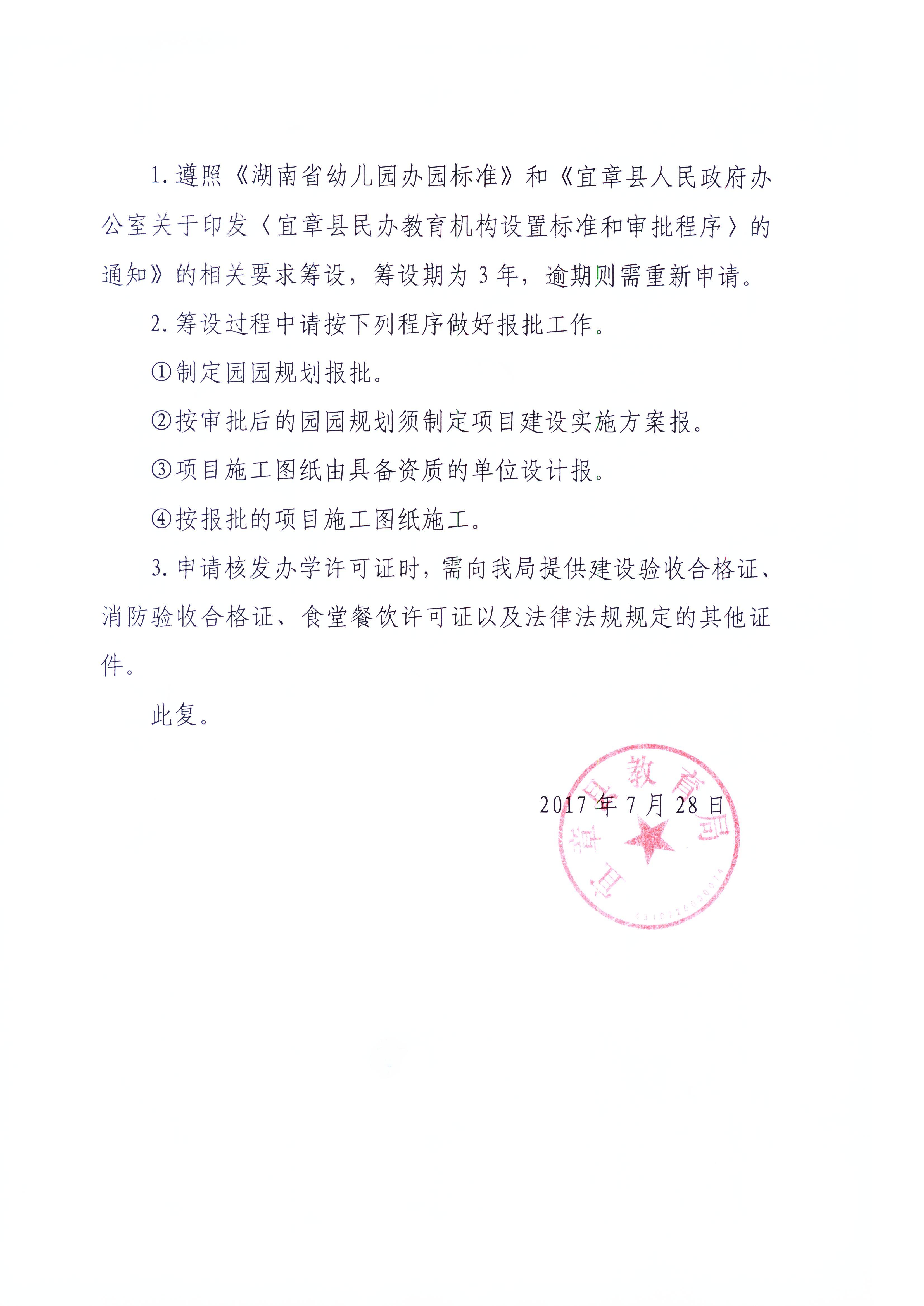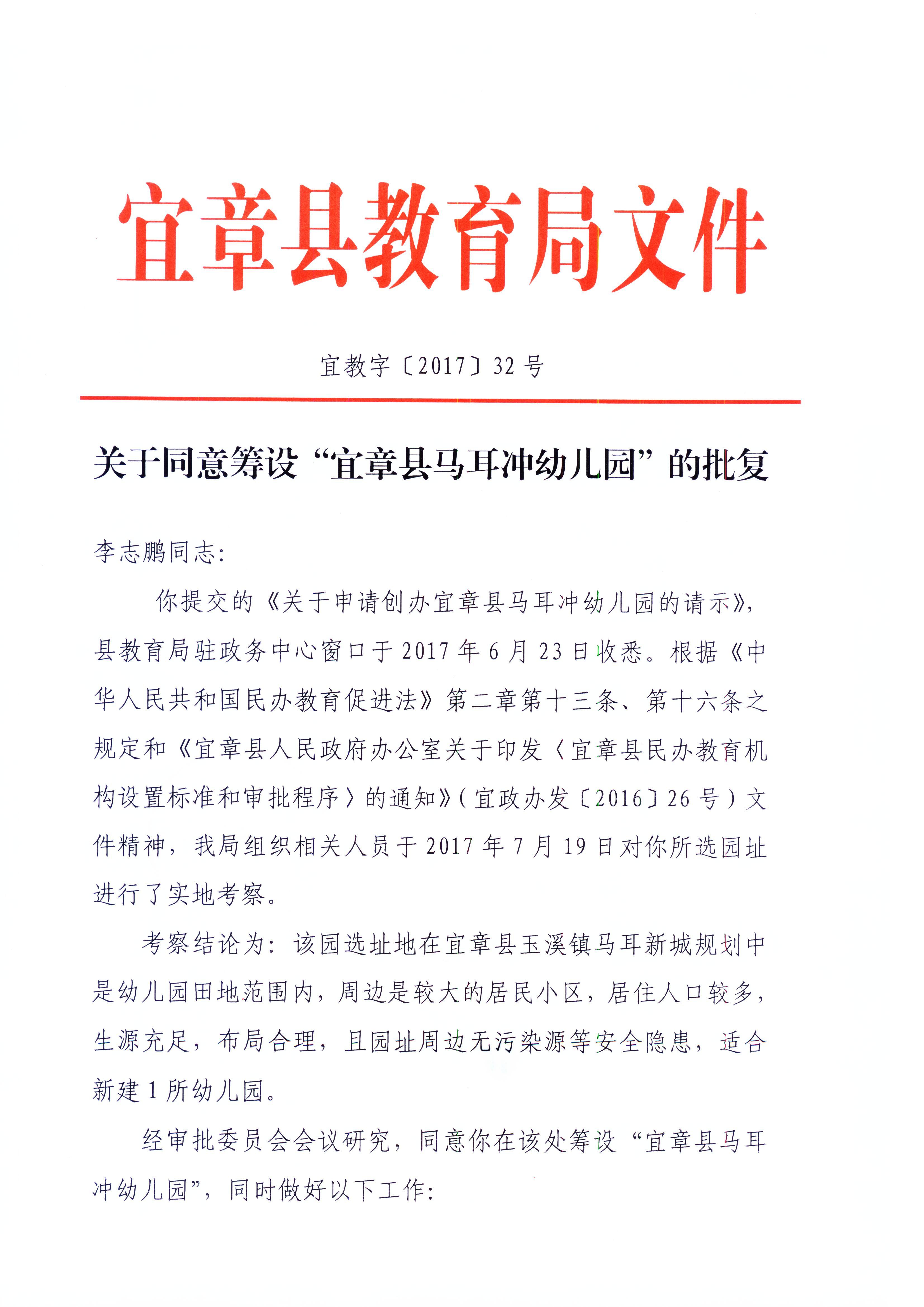 关于同意筹设“宜章县马耳冲幼儿园”的批复