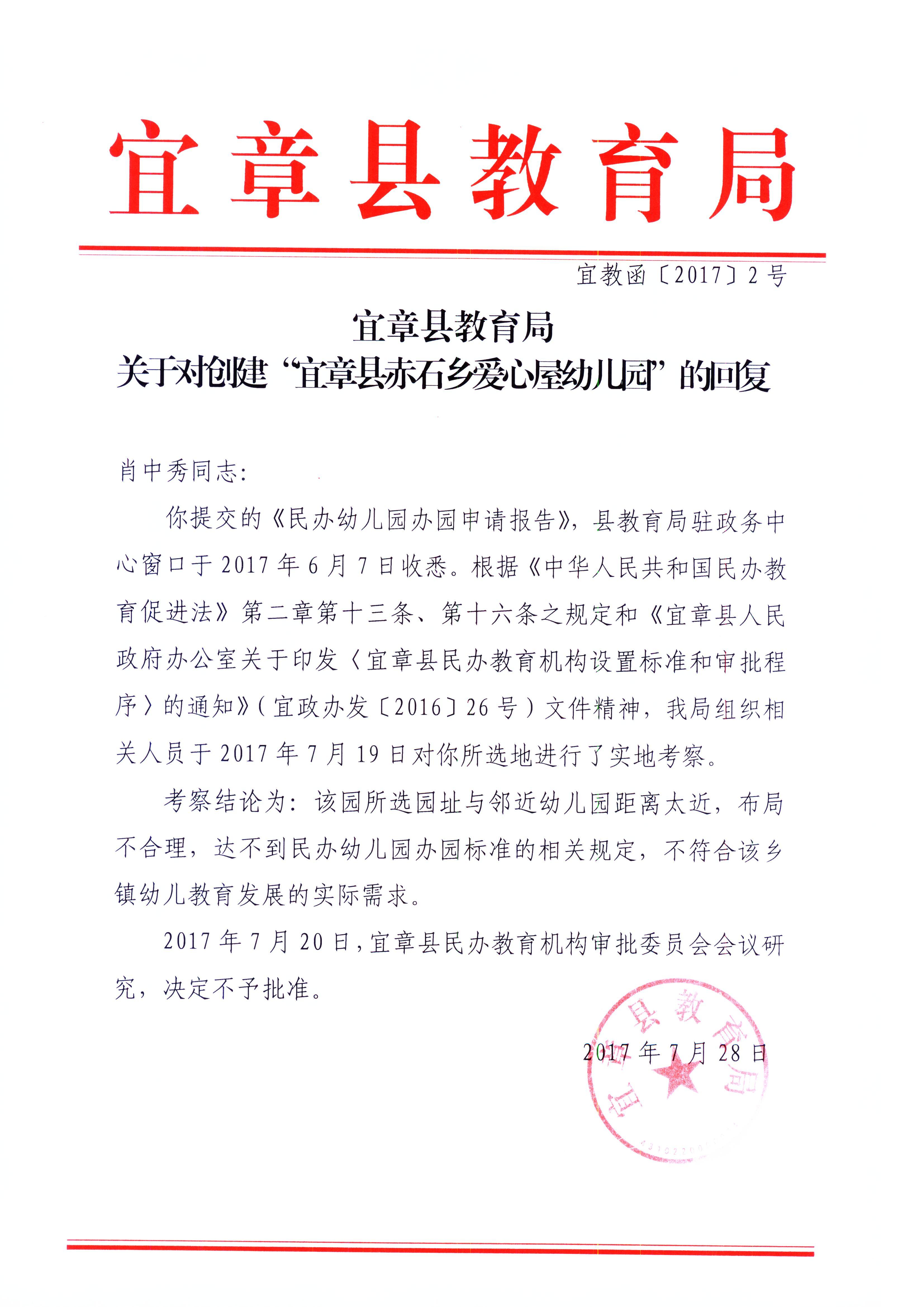 关于对创建“宜章县赤石乡爱心屋幼儿园“的回复
