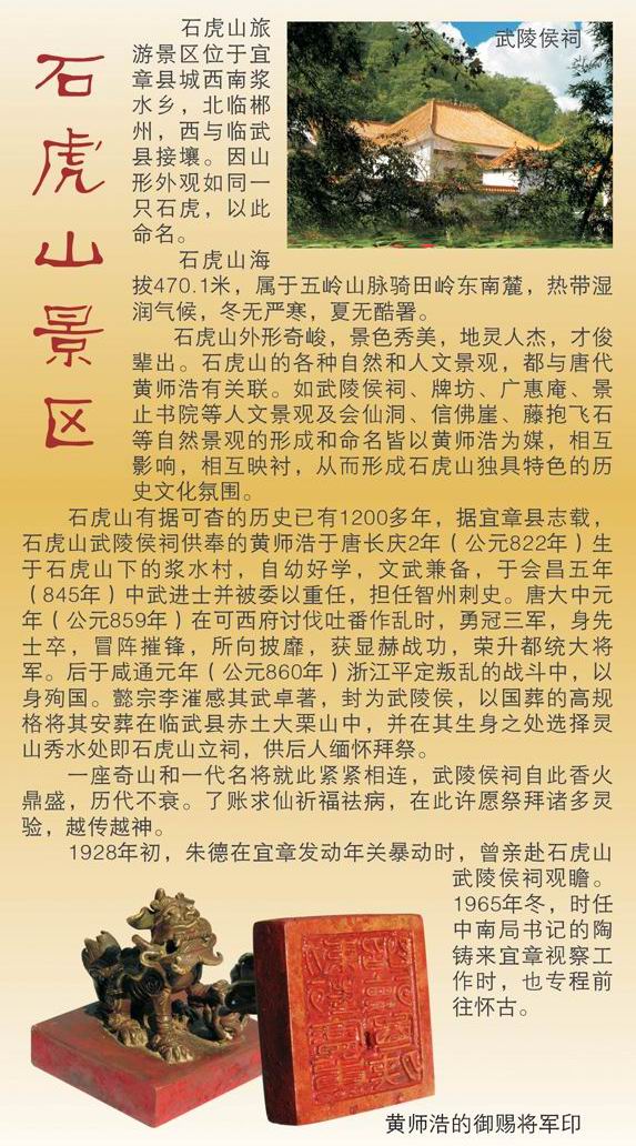 石虎山外形奇峻,景色秀美,各种自然和人文景观,都与唐代黄师浩有关联。据宜章县志载,石虎山武陵侯祠供奉的黄师浩于唐长庆2年(公元822年)生于石虎山下的浆水村,自幼好学,文武兼备,唐大中元年(公元859年)荣升都统大将军。咸通元年(公元860年),在浙江平定叛乱的战斗中以身殉国。懿宗李漼感其武功卓著,封为武陵侯,以国葬的高规格将其安葬在临武县赤土大栗山中,并在其出生地选灵山秀水处即石虎山立祠,供后人缅怀拜祭。